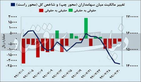 مهرماه برای دومین ماه متوالی شاهد خروج نقدینگی حقیقی از گردونه معاملات سهام بودیم. به این ترتیب در اولین ماه فصل پاییز در مجموع سهامی به ارزش ۱۰ هزار و ۲۴۷ میلیارد تومان از سبد سهام معامله‌گران خرد بازار به پرتفوی حقوقی‌ها منتقل شد.